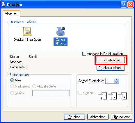 • Das Dialogfeld für die Angabe der Druckbedingungen hängt von der Anwenderprogramme ab. In manchen Fällen wird beim Auswählen des Druckers eine Seite zum Konfigurieren des Druckertreibers zum Dialogfeld hinzugefügt.