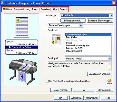 Es werden sechs Seiten mit Druckeinstellungen vom Druckertreiber angezeigt: Optionen, Seiteneinrichtung, Layout, Favoriten, Utility und Support.
