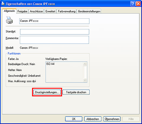 - Klicken Sie auf Druckeinstellungen, um das Dialogfeld Druckeinstellungen mit dem Namen des Druckers im Titel anzuzeigen.